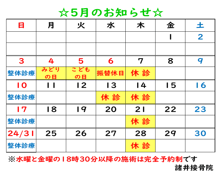 • 5月3日(日) 整体対応日(要予約)